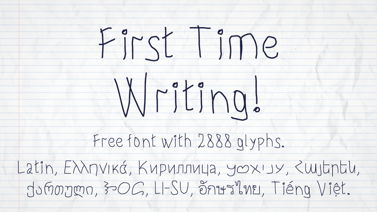 The font First Time Writing! contains 1 style and 2888 glyphs.