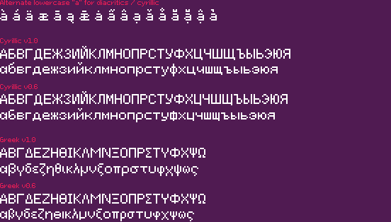 - Cyrillic and Greek improved — glyph changes: Pixeloid Sans 87, Pixeloid Sans Bold 93, Pixeloid Mono 40.